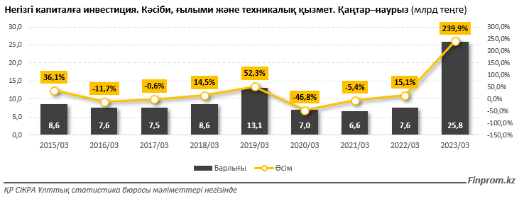 Биыл қаңтар–наурыз айларында кәсіптік, ғылыми және техникалық қызмет саласындағы негізгі капиталға салынған инвестиция 25,8 млрд теңгеге жетті, бұл бір жыл бұрынғыдан 3,4 есе артық. Күрделі салымдардың нақты өсімі 225,9% құрады.