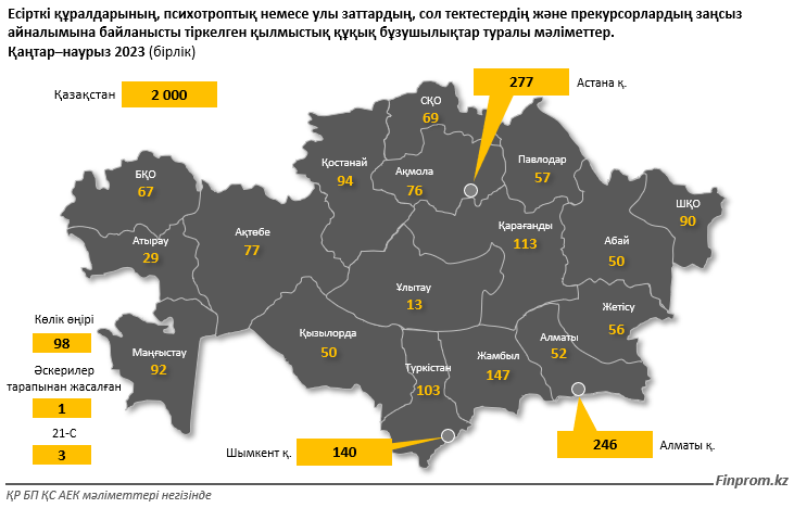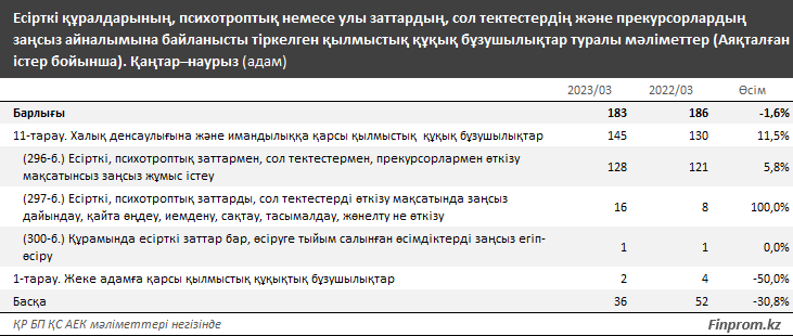 Биыл қаңтар–наурыз айларында елімізде есірткі құралдарының, психотроптық немесе улы заттардың, сол тектестер мен прекурсорларының заңсыз айналымына байланысты 2,1 мың қылмыстық құқық бұзушылық тіркелді, бұл бір жыл бұрынғыдан 5,4%-ға аз. Барлық осындай құқық бұзушылықтардың үштен екісінен астамы — 69,7% — есірткі құралдарымен өткізу мақсатынсыз заңсыз айналысуға қатысты: 1,5 мың іс, бір жылда бірден 6,4% азайған. Сондай-ақ сату мақсатындағы ұқсас құқық бұзушылықтар (502 іс, бір жылда 4,4% азайған) және айналыстан шығарылған немесе айналымы шектелген заттарды заңсыз алып өту (84 іс, 2,1 есе көбейген) жиі тіркелді. Құқық бұзушылықтарды анықтау барысында тәртіп бұзушылардан 160 көлік, 5,2 мың қару, 11 жалған құжат, сондай-ақ жалпы сомасы 532,8 млн теңгені құрайтын мүлік, ақша және құндылықтар тәркіленді. 11 қарасора, 1 апиын көкнәр және 1 жабайы кендір табылып жойылды. Өңірлер бойынша есірткі құралдарының, психотроптық немесе улы заттардың, сол тектестер мен прекурсорларының заңсыз айналымына байланысты құқық бұзушылықтар елордада жиі тіркелді: 2023 жылғы қаңтар–наурызда 277 оқиға — бір жыл бұрынғыдан 52,2% артық. Одан кейін Алматы (246 іс, 12,1% азайған) және Жамбыл облысы (147 іс, 13,5% азайған). Құқық бұзушылық санының айтарлықтай өскені елордада, ал ең көп азаюы Алматы облысында (59,1%, 52 іске дейін) байқалды. Биыл бірінші тоқсан қорытындысы бойынша, есірткі құралдарының, психотроптық немесе улы заттардың, сол тектестердің және прекурсорлардың заңсыз айналымына қатысты қылмыстық құқық бұзушылықтар бойынша 1,1 мың адам ұсталды, бұл бір жыл бұрынғыдан 6,4% артық. Оның ішінде бұрын құқық бұзушылық жасаған 91 адам, кәмелетке толмаған 5 адам, әйелдер 52 адам. Тәртіп бұзушылардың көпшілігі ҚР азаматтары: 980 адам. Сондай-ақ ТМД елдерінің 74 азаматы ұсталды, оның ішінде Өзбекстанның 38, Ресейдің 11, Қырғызстанның 9, Тәжікстанның 13, Түрікменстанның 1 азаматы. Қылмыстық құқық бұзушылықтарды мас күйінде жасаған және ішкі істер органдарында есепте тұрған азаматтардың көпшілігі 11-тарау бойынша (халық денсаулығына және адамгершілікке қарсы қылмыстық құқық бұзушылықтар) сотқа тартылған: бұл тарауда 79,2% немесе 145 адам болды. Оның ішінде 128 адам есірткі құралдарын, психотроптық заттарды, сол тектестерді өткізу мақсатынсыз заңсыз өңдеу кезінде, 16 адам өткізу, жөнелту немесе өткізу мақсатында заңсыз дайындау, өңдеу, алу, сақтау, тасымалдау кезінде ұсталды. 1 тұлға өсіруге тыйым салынған құрамында есірткі заттары бар өсімдіктерді заңсыз өсіргені үшін. Одан кейінгі ең көп жасалған қылмыс тарауы адамға қарсы қылмыстық құқық бұзушылық: бір жыл бұрын осындай құқық бұзушылық жасаған 4 адам ұсталса, биыл 2 адам ұсталды. Жыл басынан бері есірткі құрылымдарының 67 мүшесі ұсталды, деп хабарлайды zakon.kz. Заңсыз айналымнан 483,2 кило психотроптық заттар, 11 кило героин, 32,8 кило апиын, 63,7 кило гашиш, 41,6 кило марихуана және 17 тоннадан астам көкнәр шикізаты, сондай-ақ 22 тоннадан астам химиялық реагенттер тәркіленді. ҚР Ұлттық қауіпсіздік комитетінің мәліметінше, жыл басынан бері арнайы қызмет Ресей, Қырғызстан және Аустралияның құзырлы органдарымен бірлескен операцияны қоса алғанда, есірткіге қарсы 47 операция жүргізген. Есірткі айналымының 8 халықаралық және 14 өңірлік арналары, 8 ірі есірткі зертханасы жойылды.