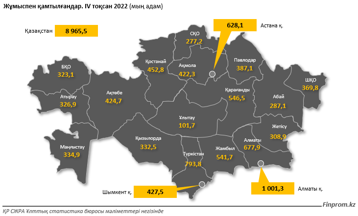 Өңірлер бойынша ең көп жұмыспен қамтылғандар Алматы қаласында: 1 млн адам — бір жыл бұрынғыдан 2,2% артық. Үздік үштікке Түркістан (793,8 мың адам, бір жылда 2,1% көбейген) және Алматы (677,9 мың адам, 30,2% азайған) облыстары да кірді. Ең аз жұмыспен қамтылғандар Ұлытау (101,7 мың адам), Солтүстік Қазақстан (277,2 мың адам) және Абай (287,1 мың адам) облыстарында.