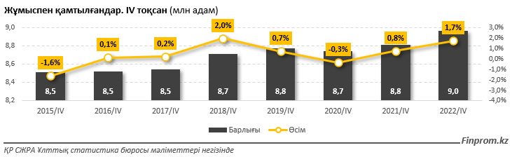 2022 жылдың төртінші тоқсанында елде 9 млн-ға жуық жұмыспен қамтылған адам болды, бұл бір жыл бұрынғыдан 1,7% көп. Қалада жұмыспен қамтылғандар саны 4,6% өсіп, 5,5 млн адамға жетті, ал ауылдық жерлерде 2,4% азайып, 3,5 млн адамды құрады.