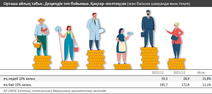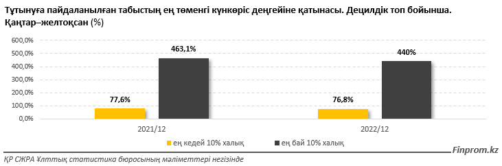 Ең байлар тобында да жағдай өзгерді. Егер 2021 жылы олардың табысы ең төменгі күнкөріс деңгейінің 463,1%-ын құраса, 2022 жылы бұл көрсеткіш 440%-ға дейін төмендеді.