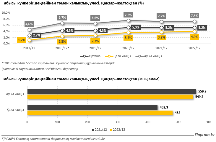 Былтыр табысы ең төменгі күнкөріс деңгейінен төмен қазақстандықтардың үлесі өзгерген жоқ. 2021 жылы ресми түрде Қазақстандағы кедейлердің үлесі 5,2% болды. Бір қарағанда, жағдай нашарлаған жоқ. Бірақ егер бұл көрсеткіштің барлық құрамдастарын егжей-тегжейлі қарастырсақ, қорытынды басқаша болады. Біріншіден, жалпы үлестің өзгермейтіндігіне қарамастан, кедейшілікте өмір сүретін қала тұрғындарының үлесі 3,8%-дан 4%-ға, ал ауылдықтар — 7,2%-дан 7,3%-ға дейін өсті. Екіншіден, кедейлердің абсолютті саны былтыр 39,7 мыңға — 992,1 мыңнан 1,031 млн адамға (4%) өсті. Бұл әсіресе қала тұрғындары арасында байқалады, онда абсолютті мәнде кедейлердің саны 12% өсті.