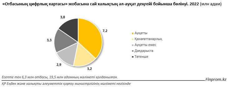 Мәселен, осы есептеулер бойынша Қазақстандағы 50,5% отбасын немесе 10,4 млн адамды ғана ауқатты және қанағаттанарлық деңгейіне жатқызуға болады. Қалған 49,5% отбасы немесе 9,1 млн адам проблемалық санатқа жатқызылған. Байқасаңыз, ұлттық стандарттар бойынша есептелген кедейлер санымен салыстырғанда қандай үлкен айырмашылық бар: 9,1 млн және 1 млн адам.