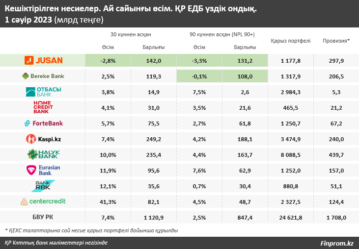 Биыл 1 сәуірде ҚР ЕДБ-де 30 күннен астам кешіктірілген несиелер 1,1 трлн теңге болды, бұл бір ай бұрынғыдан 7,4% артық. 90 күннен астам ұзақ кешіктірілген «нашар» несиелер (NPL 90+) бір айда 2,5% өсіп, 847,4 млрд теңгеге жетті. Бұл ретте ҚР ЕДБ несие портфелі бір айда 1,4% өсіп, 24,6 трлн теңгеге жетті, деп хабарлайды newsroom.kz. Жалпы, сәуірде ҚР ЕДБ-де 30 күннен астам кешіктірілген қарыздардың үлесі 4,6%-ға (бір ай бұрын 4,3% болған) жетті, NPL 90+ үлесі 3,4% болды (бір айда 0,03 п. т. өсті). Ай сайынғы динамика бойынша несие портфелін үздік он банктің ішінде 6 банк, ал жалпы сектордағы 13 банк көбейтіп отыр. Еліміздегі ең ірі он кредитор банк ішінде бір ғана қаржы институты — Jusan Bank қана ай сайынғы динамика бойынша 30 күннен астам кешіктірілген несие көлемін 2,8% азайтып, биыл наурыз айында 142 млрд теңгеге дейін төмендете алды. NPL 90+ көлемін алғашқы ондықтағы екі банк азайтты. Ең жақсы көрсеткіштер Jusan Bank-те: бір айда 3,3% төмендеп, 131,2 млрд теңге болды. Бұл ретте Jusan Bank-тің несие портфелі бір айда 2,9% өсіп, 1,2 трлн теңгеге жетті. Jusan Bank портфеліндегі NPL 90+ үлесі шамамен 11%, бұл сектор бойынша орташа деңгейден жоғары, алайда NPL көлемі банк провизиялары есебінен жабылған, ол 1 сәуірдегі жағдай бойынша 297,9 млрд теңгені құрады, бұл бірден 2,3 есе көп. Бұл критерий бойынша Jusan Bank Еуразиялық Банкпен (2,5 есе), ЦентрКредит Банкімен (2,6 есе) және Halyk Bank-пен (2,7 есе) бірге еліміздің ірі банктері арасында үздік көрсеткіштерді көрсетіп отыр. Анықтама үшін: сектордағы провизиялардың орташа көлемі NPL 90+ көрсеткішінен екі еседен астам көп. Jusan Bank портфеліндегі NPL проблемалық Цеснабанк пен АТФ банктің «мұрасымен» байланысты болғандықтан, тарихи жағдайды ескере отырып, қазіргі көрсеткіштерді өте оң деп санауға болады. Теріс көрсеткішті төмендеткен екінші банк — Bereke Bank, бірақ мұнда NPL 90+ бар болғаны 108 млрд теңгеге дейін, 0,1% ғана азайды. Бұл ретте банктің несие портфелі де төмендеді: бір айда 0,3% азайып,1,3 трлн теңге болды. Bereke Bank портфеліндегі ұзақ кешіктірілген берешек үлесі 8,2%. Банк провизиялары NPL 90+ деңгейінен 1,9 есе көп, бұл сектордағы орташа көрсеткіштен сәл төмен. Бұл жерде кешіктірілген несиенің көптігі қаржы институтының жалпы мәселелерімен байланысты болса керек, одан Bereke Bank акционерлері мен атауын өзгерту арқылы ғана құтыла алды. Еске салайық: геосаяси дағдарыстың салдарынан санкцияға ұшыраған ресейлік Сбербанктің бұрынғы үлескері кейін атауын осылай Bereke Bank деп өзгерткен еді. Содан кейін биыл наурыз айында ғана қазіргі қазақстандық банк санкциялардан шығарылды.