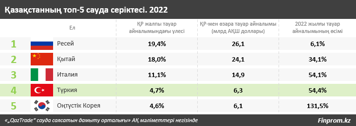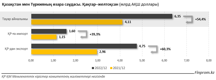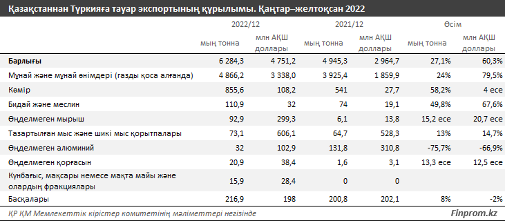 Сауда-экономикалық қарым-қатынаста Түркия Қазақстан үшін ең алдымен біздің тауарларды сатып алушы, содан кейін ғана жеткізуші. Өзара сауданың төрттен үш бөлігі — 74,9% — Қазақстанның экспорты. Былтыр еліміз Түрік Республикасына 4,8 млрд АҚШ долларының тауарын сатты, бұл 2021 жылмен салыстырғанда 60,3% көп. Бұған жеткізудің физикалық көлемінің өсуі және өнім құнының өсуі ықпал етті.