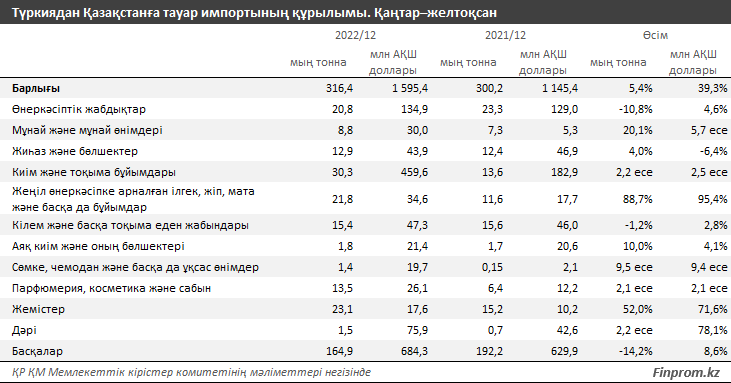 Түркия бізден шикізат сатып алатын болса, біз олардан өңдеу өнеркәсібі өнімдерін сатып аламыз. Ақшалай импорттың үштен бірі киім мен тоқыма бұйымдарға тиесілі. Былтыр қазақстандықтар түрікітің киіміне 459,6 млн АҚШ долларын жұмсады, бұл 2021 жылдағымен салыстырғанда 2,5 есе көп.