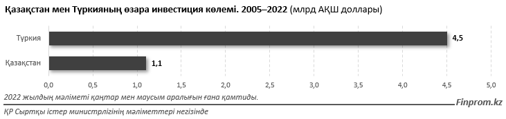 мәліметінше, 2005 жылдан бастап 2022 жылдың шілдесіне дейін түрік инвесторлар Қазақстандағы түрлі жобаларға 4,5 млрд АҚШ долларын салды. Ал Қазақстан Түркиядағы бизнеске 1,1 млрд АҚШ долларын құйды.