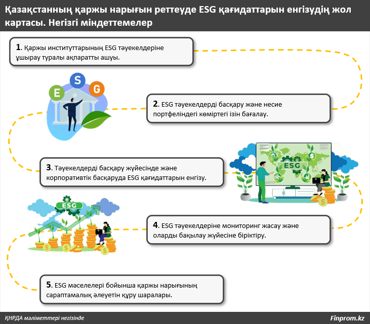 Сондықтан қаржы институттарына ESG енгізу, сондай-ақ жасыл қаржы нарығын дамыту мәселелері Қазақстан Республикасы Қаржы нарығын реттеу және дамыту агенттігінің басым күн тәртібіне енгізілді деп күтілуде. Агенттік Қазақстанның қаржы нарығын реттеуде ESG қағидаттарын енгізу бойынша Жол картасын әзірледі.