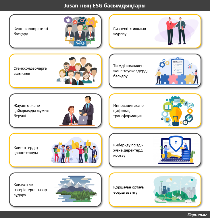 жариялаған алғашқы банк болды. Бұл ретте банк жеке есеп шығаратын ЕДБ-нің бірі. Сапалық және сандық деректері Global Reporting Initiative (GRI) халықаралық стандарттарына сәйкес дайындалған есеп Jusan Bank-тің ESG және банк ісін жауапты жүргізу саласындағы 2022 жылғы қызметі, жетістіктері мен негізгі нәтижелері туралы жан-жақты және объективті ақпарат береді. Атап айтқанда, әлеуметтік даму, қоршаған ортаға әсер, корпоративтік басқару, адам құқықтары, іскерлік этика және басқа да бірқатар өзекті тақырыптарға баса назар аударылды. Jusan Bank-тің БҰҰ Тұрақты даму мақсаттарының күн тәртібіне қосқан үлесі анықталды. Төмендегі инфографикада біз банктің ESG аясындағы негізгі басымдықтарын атап өттік.