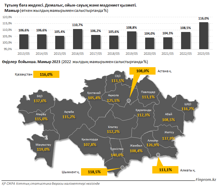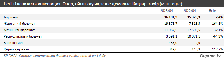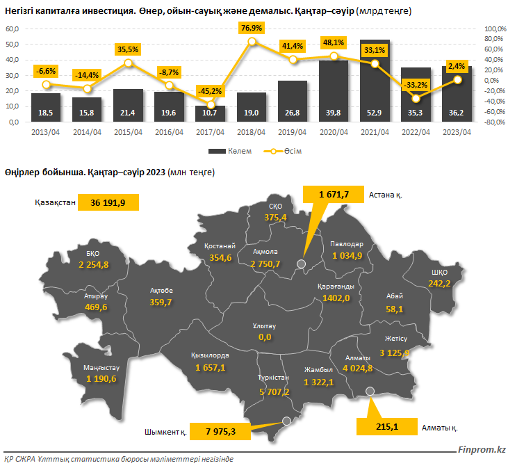 Биыл қаңтар–сәуірінде өнер, ойын-сауық және демалыс саласына салынған күрделі салымдардың көлемі 36,2 млрд теңге болды — бұл былтырғы сәйкес кезеңмен салыстырғанда ақшалай түрде небәрі 2,4% көп (ФКИ — небәрі 98,3%). Бір жыл бұрын қаңтар–сәуірде күрделі салымдар көлемі үштен бірге (ФКИ — 63,1%) қысқарған еді. Бұл ретте 2021 жылы осы кезеңде секторға рекордтық инвестиция тіркелді: 52,9 млрд теңге (ФКИ — 130,9%). Өңірлер бойынша өнер, ойын-сауық және демалыс саласына инвестицияның ең көп көлемі Шымкентке тиесілі: 8 млрд теңгеге жуық. Олардан кейін Түркістан (5,7 млрд теңге), Алматы (4 млрд теңге) және Жетісу (3,1 млрд теңге) облыстары. Биыл секторды қаржыландырудың негізгі көзі жергілікті бюджеттер болды, 2022 жылғы қаңтар–сәуірдегі 7,5 млрд теңгенің орнына 19,9 млрд теңге күрделі инвестиция қарастырылған. Кәсіпорындардың меншікті қаражаты 12 млрд теңгені құрады, бұл былтырғы сәйкес кезеңмен салыстырғанда ақшалай түрде 32,1% аз. Республикалық бюджет есебінен инвестиция 2,8 есе, яғни 3,6 млрд теңгеге дейін қысқарды. Банк несиесі мен қарыз қаражат тиісінше небәрі 455 млн және 319,6 млн теңге болды. Демалыс, ойын-сауық және мәдениет саласындағы қызмет құны биыл мамырда бір айда 2,7%, бір жылда 16% өсті. Салыстыру үшін: бір жыл бұрын өсім 8,5% болған. Өңірлер бойынша баға ең көп Түркістан облысында қымбаттады: бір жылда бірден 40%. Одан кейін Жетісу (37,9%), Батыс Қазақстан (37,6%), Алматы (26,9%) және Ақмола (25,5%) облыстары. Ең аз қымбаттаған өңір Қостанай облысы: 5,4%. Балалар аттракциондары секторда айтарлықтай қымбаттады: бір жылда 24,5%. Мерекелік шараларды ұйымдастырушылардың қызметі 23,4% қымбаттады. Кинотеатрлар мен театрлар бағаны тиісінше 12,6% және 5,7% көтерді.