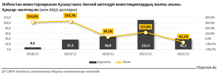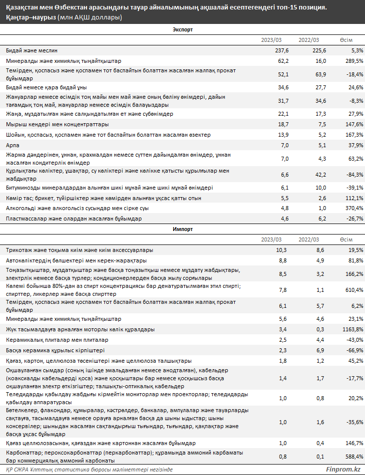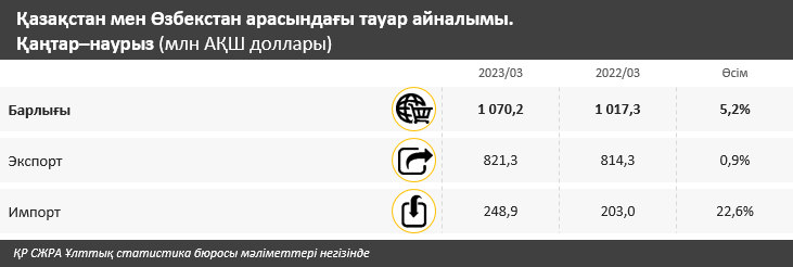 Биыл қаңтар–наурыз айларының қорытындысы бойынша, Қазақстан мен Өзбекстан арасындағы тауар айналымы 1,1 млрд АҚШ доллары болды, былтырғы осы уақыттағы көрсеткіштен 5,2% көп. Тауар айналымының басым бөлігі (76,7%) ҚР-дан экспортталды. Жыл басынан бері экспорт 0,9% өсіп, 821,3 млн АҚШ доллары болса, импорт 22,6% өсіп, 248,9 млн АҚШ долларына жетті. Қазақстанның тауар айналымы құрылымында Өзбекстанның үлесі 3,3%-ды құрады. Өзбекстанның үлесіне ҚР-дан экспорттың 4,4%-ы, импорттың 1,8%-ы тиесілі. Биыл бірінші тоқсан қорытындысы бойынша, Қазақстаннан Өзбекстанға ақшалай есептегенде ең көп экспорт бидай мен меслин экспорттады: 237,6 млн АҚШ доллары — бір жыл бұрынғыдан 5,3% артық. Басқа негізгі экспорттық санаттар тыңайтқыштар, тот баспайтын болаттан жасалған бұйымдар, бидай ұны, тоң май мен май. Қазақстан Өзбекстаннан негізінен трикотаж бұйымдарын импорттады: 10,3 млн АҚШ доллары — бір жыл бұрынғыдан 19,5% көп. Көліктердің қосалқы бөлшектері, тоңазытқыш пен мұздатқыш, спирттер мен тегіс өнімдер де көп импортталады. Бұл арада өзара сауда көрсеткіштері бұрынғыдан да айтарлықтай өсуі мүмкін: өткізу қабілетін арттыру мақсатында Қазақстан мен Өзбекстан кеден органдары келісім бойынша күшейтілген жұмыс режиміне көшті, деп хабарлайды zakon.kz. 2022 жылғы қаңтар–желтоқсанда Өзбекстаннан Қазақстанға тікелей инвестицияның жалпы ағыны 42,2 млн АҚШ долларын құрады, бұл бір жыл бұрынғыдан бірден 62,2% аз. Анықтама үшін: 2021 жылдың осы кезеңінде Өзбекстаннан Қазақстанға шетелдік инвестициялардың жалпы ағыны жылдық 2,2 есе өсіммен 111,5 млн АҚШ долларына жетті. Қазақстан резиденттерінің Өзбекстан инвесторлары алдындағы міндеттемелері биыл 1 қаңтарында 331,4 млн АҚШ долларын құрады, бұл бір жыл бұрынғы көрсеткіштен 8,7% артық. Анықтама үшін: өткен жылдың сәйкес кезеңінде бұл көрсеткіш 304,8 млн АҚШ долларын құрап, бір жыл ішінде 20,4% өскен.