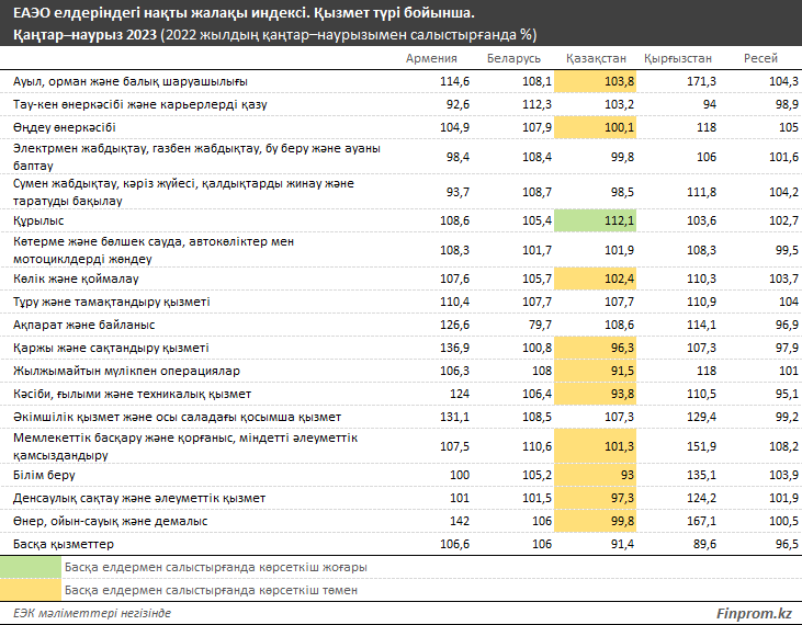ҚР-дағы әртүрлі салалардағы жалақының өсуін қарастыратын болсақ, 19 қызмет түрінің 9-да биыл қаңтар–наурыз айларында нақты жалақы индекстері 100%-дан төмен болғанын атап өтуге болады. Бұл тек денсаулық сақтау (97,3%), білім беру (93%) және коммуналдық қызмет (98%-99%) секілді бюджеттік салалар емес, сонымен қатар сараптамалық (93,8%), сондай-ақ қаржылық және сақтандыру (96,3%).