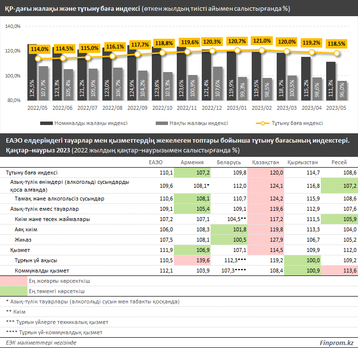 Жоғарыда жазғанымыздай, нақты жалақы индексі тұтыну бағасының өсуіне тікелей байланысты. Былтыр мамырдан бергі уақыт аралығында Қазақстанда инфляцияның ең жоғары деңгейі 2023 жылғы қаңтар–наурызда (120% -121%) байқалды. Диаграмма бағаның өсуі жалақының номиналды өсуіне қалай сәйкес келетінін көрсетеді.