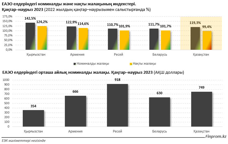 Сонымен қатар, ең үлкен өсімге қарамастан, Қырғызстан азаматтарының жалақысы ЕАЭО елдеріндегі ең аз жалақы болып қалып отыр. Биыл қаңтар–наурыз айларында Қырғыз Республикасы резиденттерінің орташа айлық атаулы жалақысы небәрі 354 АҚШ долларын құрады. Қазақстанда, ЕЭК салыстырмалы деректеріне қарағанда, қаңтар–наурызда екі есе көп: 749 АҚШ доллары. Номиналды табыстың долларлық баламасы бойынша Қазақстан одақта Ресейден (918 доллар) кейінгі екінші орында.