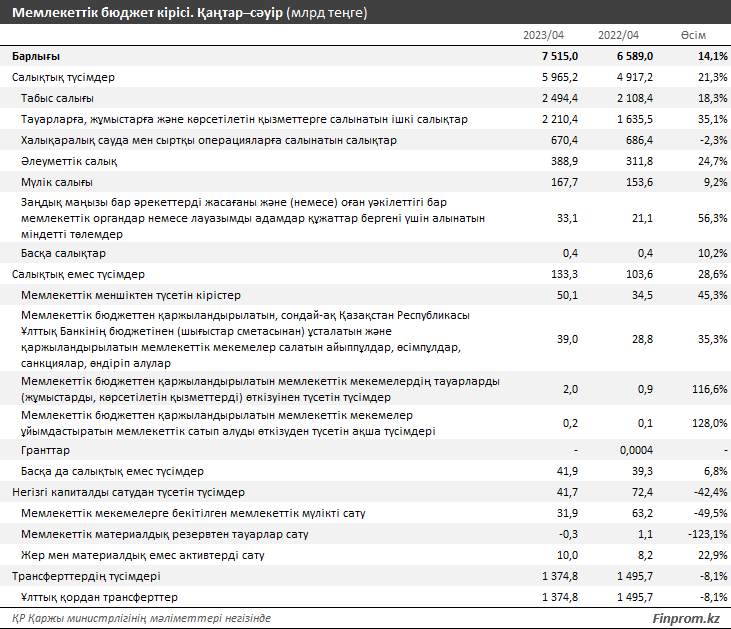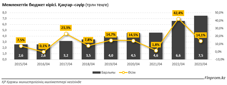 Биылғы қаңтар–сәуір айларында мемлекеттік бюджет кірісі 7,5 трлн теңгені құрады, бұл былтырғыдан 14,1% көп.