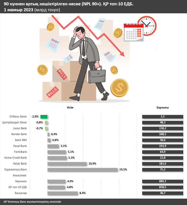 Айта кетерлігі, ҚР кредитор банктерінің ондығында Отбасы банкі мен ЦентрКредит банкінен басқа, портфель сапасы орташа деңгейден жақсы банктер қатарында Halyk Bank (NPL 90+ үлесі 2,2%) және Bank RBK (3 ,42%) бар. Ондықтағы қалған ЕДБ-дегі 90 күннен артық кешіктірілген қарыздар үлесін ондықтың орташа көрсеткішінен жоғары.