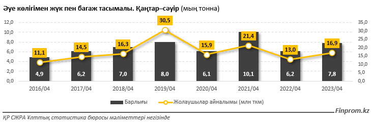 Биыл қаңтар–сәуір айларында жүк айналымы 16,9 млн ткм құрады, бұл былтырғымен салыстырғанда 30,3% артық.