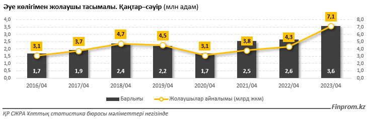 Жолаушылар тасымалы саласында биыл қаңтар–сәуір айларында әуе компаниялары 3,6 млн адамды тасымалдады, бұл бір жыл бұрынғыдан 36% артық. Ең көп көрсеткіш Алматыда тіркелді: 1,2 млн адам, бір жыл бұрынғыдан 34,9% артық. Алғашқы бестікке Астана (951,8 мың жолаушы), Шымкент (346,3 мың жолаушы), сондай-ақ Атырау (305,5 мың жолаушы) және Маңғыстау (220,7 мың жолаушы) облыстары енді.
