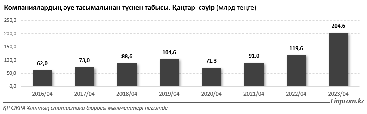 Биыл қаңтар–сәуір айларында әуе тасымалымен айналысатын компаниялардың табысы 204,6 млрд теңге болды, былтыр көрсеткіш 119,6 млрд теңге болды. Құндық мәндегі жылдық өсім 71,1%. Оның ішінде барлық бағыттар бойынша жүк пен багаж тасымалынан түскен табыс 4,2 млрд теңге, жолаушылар тасымалынан түскен табыс 200,4 млрд теңге болды.