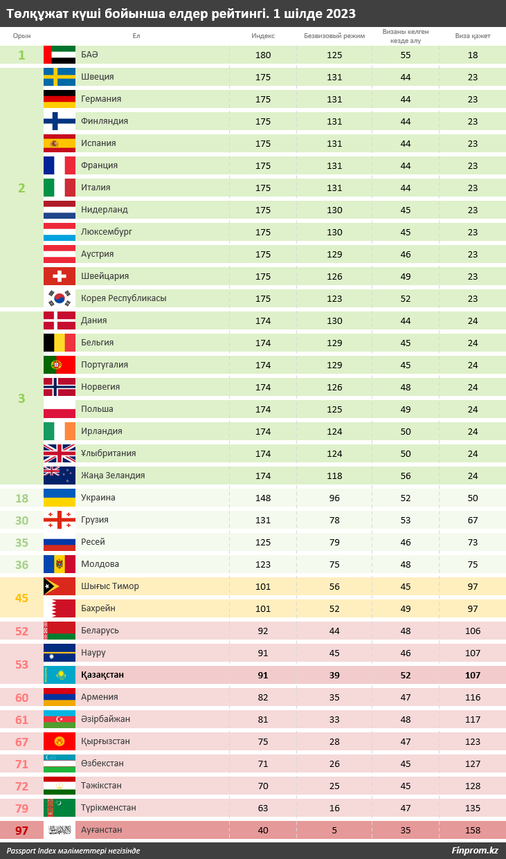 ҚР-ның индексі 91 болды (көрсеткіш неғұрлым жоғары болса, елдің төлқұжаты соғұрлым күшті). Қазақстан төлқұжаты бар азаматтар 39 елге визасыз бара алады, тағы 52 елге кірген кезде виза ала алады, ал 107 елде қазақстандықтарға виза қажет. Бір қызығы, ҚР Тынық мұхитындағы ергежейлі арал мемлекет Наурумен қатар тұр.