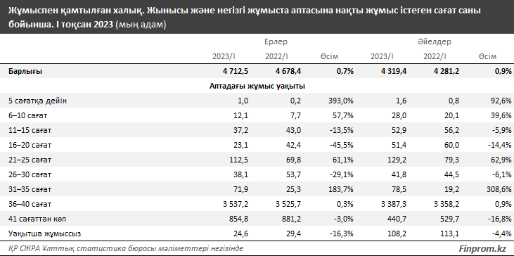 Биыл бірінші тоқсанында елімізде 9 млн адам жұмыспен қамтылды, бұл бір жыл бұрынғыдан 0,8% артық. Жұмыспен қамтылғандардың басым бөлігі — ҚР-дағы жалпы санның 76,7%-ы белгіленген максималды жұмыс істеді: аптасына 36–40 сағат. Олардың саны бір жылда 0,6% өсіп, 6,9 млн адамға жетті. Тағы 14,3% артық жұмыс істеген: аптасына 41 сағат немесе одан да көп. Мұндай адамдар 1,3 млн болды, бұл бір жыл бұрынғыдан 8,2% аз. Аптасына 35 сағаттан аз 679,2 мың адам жұмыс істеді, бұл бір жыл бұрынғыдан 30% артық. Оның ішінде 2,5 мың адам 5 сағат және одан аз жұмыс істеді, 40,2 мың адам — 6–10 сағат, 90,1 мың адам — 11–15 сағат, 74,5 мың адам — 16–20 сағат, 241,7 мың адам — 21–25 сағат, 79,9 мың адам — 26–30 сағат, 150,4 мың адам — 31–35 сағат жұмыс істеді. Қазақстандықтардың орташа жұмыс уақыты аптасына 38 сағат. Соның ішінде ерлер — орта есеппен 40 сағат, әйелдер — 37 сағат. Жынысы бойынша апталық максималды жұмыс істейтін ерлер осылай жұмыс істейтін әйелдерден көп. Сондай-ақ, ер адамдар шамадан тыс жұмыс істеуге бейім болды. Осылайша, аптасына 36–40 сағат жұмыс істейтін ерлердің саны 3,5 млн, бұл әйелдерден 149,9 мыңға көп. 41 және одан да көп сағат жұмыс істеген 854,8 мың ер болса, әйелдер одан екі есе аз, 414,1 мың. Аптасына 35 сағатқа дейін жұмыс істейтіндердің арасында 383,3 мың әйел, 295,9 мың ер адам болды. Айырмашылық 29,5%-ды құрады. Жасы бойынша 35–44 жас аралығындағы адамдар жиі жұмыс істеді: 378,4 мың адам — бір жыл бұрынғыдан 11,6% аз. «Еңбекқорлардың» арасында мына топтар да бар: 45–54 жас (283,1 мың адам) және 29–34 жас (242,7 мың адам). Жастар арасында 16–24 жас аралығындағы 122,5 мың адам, 25–28 жас аралығындағы 128,8 мың адам 41 сағат және одан да көп жұмыс істеген. Сондай-ақ 55–64 жас аралығындағы 137,2 мың адам, 65 және одан жоғары жастағы 2,6 мың адам артық жұмыс атқарған. Аптасына 35 сағатқа дейін 15 жастағы — 38 адам, 16–28 жастағы — 104,7 мың адам, 29–34 жастағы — 107,4 мың адам, 35–44 жастағы — 155,4 мың адам, 45–54 жастағы — 147,9 мың адам, 55–64 жастағы — 120,8 мың адам және 65 және одан жоғары жастағы 43 мың адам жұмыс істеді.