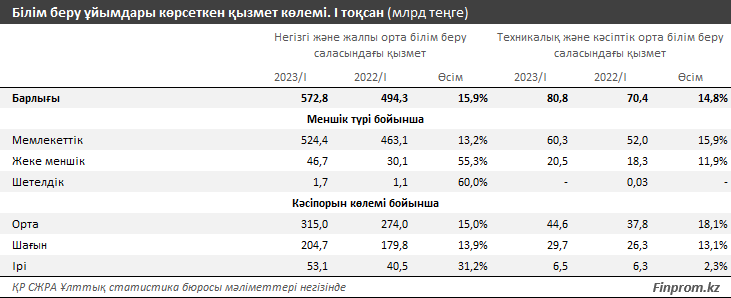 Техникалық біліммен қатар негізгі және жалпы орта білім беру саласындағы қызметтер де оң үрдісті көрсетіп отыр. Көрсетілген қызмет көлемі 572,8 млрд теңгені құрап, бір жыл ішінде 15,9% өсті. Оның ішінде бюджет қаражаты есебінен 540,4 млрд теңге, халық қаражаты есебінен 29,9 млрд теңге, кәсіпорындар есебінен 2,4 млрд теңгеге қызмет көрсетілді.