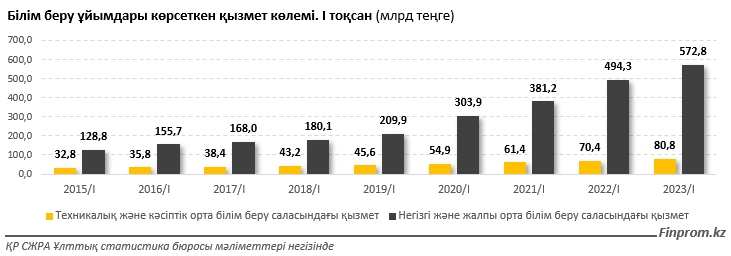 Биыл бірінші тоқсанда елімізде техникалық және кәсіптік орта білім беру саласында қызмет көрсету көлемі айтарлықтай өсіп, 80,8 млрд теңгеге жетті, бұл бір жыл бұрынғыдан 14,8% көп.
