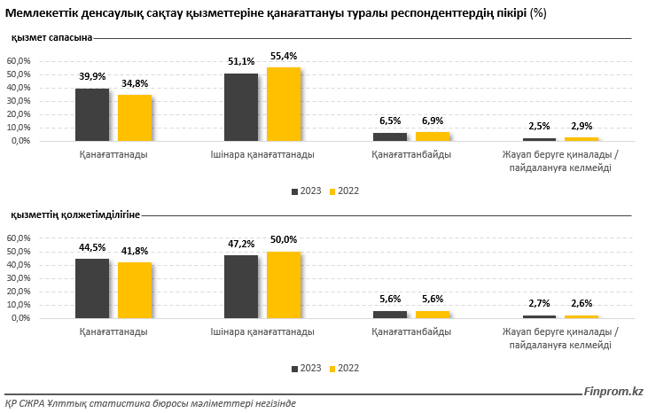 Биыл наурызда 15 жастан асқан 12 мыңға жуық респондент қатысқан «Халықтың өмір сүру сапасы» сауалнамасының нәтижесі бойынша, мемлекеттік денсаулық сақтау саласының сапасына қанағаттану деңгейі 39,9% болды, 2022 жылы 34,8% болған. Бұл ретте қанағаттанбайтындардың үлесі 6,9%-дан 6,5%-ға дейін төмендеді. Сонымен қатар, ішінара қанағаттанатын қазақстандықтардың үлесі де 55,4%-дан 51,1%-ға дейін төмендеді.