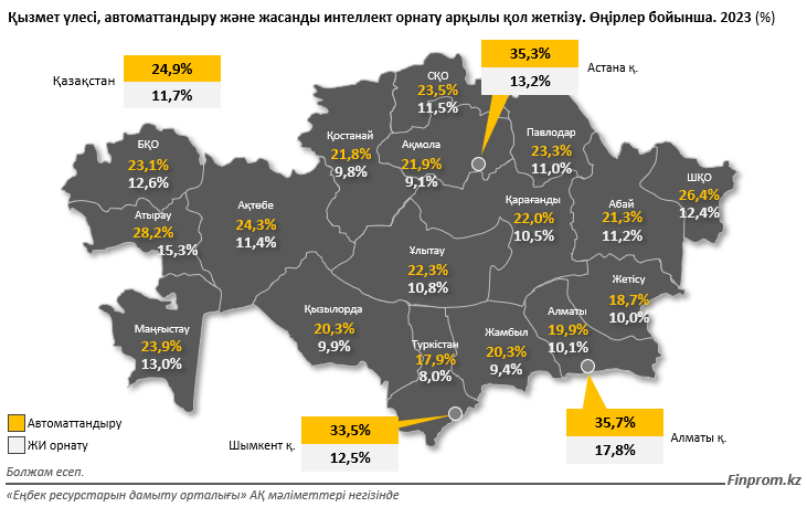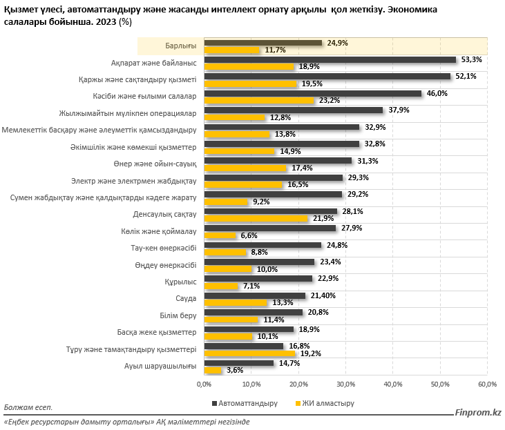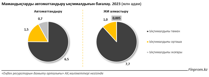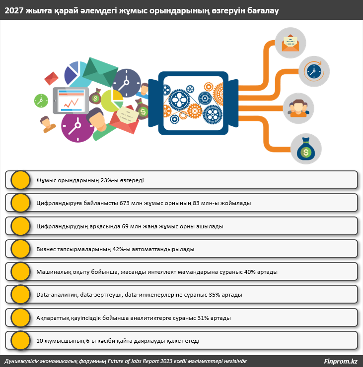 Дүниежүзілік экономикалық форумның сарапшылары цифрландырудың әлемдік еңбек нарығына әсерін бағалады. Халықаралық ұйымның сарапшылары 2027 жылға дейінгі жұмыспен қамтудың болашағы туралы есебінде бес жылдан кейін жұмыс орындарының 23%-ы өзгеретінін жазады. ДЭФ мамандары мұндай қорытындыға 45 елден, соның ішінде Қазақстан да бар, 800-ден астам жұмыс берушіге сауалнама жасап келіп отыр. Есеп авторларының басты назары — жалпы еңбек нарығының трансформациясы. Өндірісті автоматтандыру және ақпараттық технологияларды енгізу салдарынан бес жылда 673 млн жұмыс орнының 83 млн-ы мүлдем жойылып кетуі мүмкін. Олардың 69 млн-ы — жаңа мамандықтардың пайда болуына байланысты басқа жұмысқа бағытталуы мүмкін. Кейбір таныс мамандықтардың тарихқа айналуы теріс үрдіс емес, жағымды үрдіс ретінде қабылданады. Кәдімгі қол еңбегінен бас тартып жаңа өндірістерді дамытуды, бизнесте IT-технологияларды ілгерілетуді ескереді. Мамандардың айтуынша, бес жылда бизнес тапсырмаларының 42%-ы автоматтандыру жоспарланған. Атап айтқанда, бұл аналитика және үлкен деректерді өңдеу, жұмыста цифрлық қызметтерді пайдалану. Мұндай ақпараттық қызметтерге сұранысты қанағаттандыру үшін еңбек нарығы үлкен деректерді түсінетін, BIM қандай ақпарат қамтитын құрылыс екенін, және жасанды интеллектті қалай үйрету керектігін білетіндерді қабылдайды. Қазірдің өзінде жоғары мамандандырылған «IT-жұмысшыларға» деген сұраныстың жоғарылығы бүкіл әлем бойынша осындай адамдарды жалдауға мәжбүрлеуде. Бес жылдан кейін нарыққа қажетті бұл кәсіптерге сұраныс 31%-40% өседі. Автоматтандырудың Қазақстандағы еңбек нарығына қалай әсер ететінін түсіну үшін «Еңбек ресурстарын дамыту орталығы» АҚ (Еңбек және халықты әлеуметтік қорғау министрлігіне қарасты ұйым) мамандары өз зерттеулерін жүргізді. Олар кәсіптердің әр тобында қандай еңбек функцияларын автоматтандыруға немесе тіпті жасанды интеллектке сеніп тапсыруға болатынын бағалады. 8,7 млн қызметкердің деректері ескерілді. 300 мың жұмысшы іріктеуге кірмеді, себебі әртүрлі себептермен олар үшін негізгі еңбек функцияларының сипаттамасы жоқ. Мәселен, сарапшылардың қорытындысына сәйкес, жұмыс істейтін қазақстандықтардың 75,1%-ның жұмысы жақын арада автоматтандырылуы екіталай. Бұл 6,5 млн жұмысшы. Экономикада жұмыс істейтіндердің 17%-ы (1,5 млн адам) жұмысы өндіріс автоматына немесе жасанды интеллектке сеніп тапсырылуы мүмкін. Қазақстанда технологияның әсерінен жұмыстан қуылғандар 7,9% немесе 686 мың адамды құрады. Ескерту: өндірістегі жасанды интеллекттің еңбек нарығына әсері туралы деректер, автоматтандыру көрсеткіштерінен айырмашылығы біршама ерекшеленеді. Бұл Қазақстанның ресурстық экономикасының ерекшеліктеріне де, жасанды интеллект күрделі цифрлық процесс ретінде баяу енгізілуіне де байланысты. Жасанды интеллект арқылы лауазымдық міндеттерді толық немесе ішінара ауыстыру мүмкін емес жұмысшылардың жалпы үлесі 88,1% (7,7 млн адам). Мұндай сценарийдің орташа ықтималдығы қызметкерлердің 11,6% немесе 1 млн адамға қатысты. Бірақ мұндай ықтималдықтың жоғары дәрежесі тек 5 мың қазақстандыққа немесе 0,1%-на ғана тиесілі. Осындай жұмыстардың бір мысалы ретінде ірі агрегаторлар келгеннен кейін қызметтері толығымен дерлік электронды жүйелерге өткен такси қызметінің call-орталықтарының менеджерлерін атауға болады. Адам орындайтын кейбір