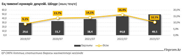 2023 жылғы шілдеде ҚР-да жан басына шаққандағы ең төменгі күнкөріс деңгейі 49,5 мың теңге болды, бұл былтырғыдан 10,5% көп.