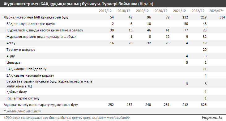 Құқық бұзушылықтың барлық түрлерінің ішінде журналистердің кәсіби қызметіне кедергі жасау істері жиі байқалды. 2022 жылы мұндай шағымдар 73 болса, 2021 жылы 77 болған. Айтпақшы, ҚР Бас прокуратурасының Құқықтық статистика және арнайы есепке алу жөніндегі комитетінің (БП ҚС АЕК) ресми есептерінде қылмыстық істердің саны ҚР ҚК 158-бабы («Журналистердің жұмысына кедергі жасау») бойынша қозғалған қылмыстық іс соңғы жылдары екі-үштен аспаған. ҚС АЕК мен «Әділ сөз» деректеріндегі мұндай үлкен айырмашылық, ең алдымен, әрбір журналистің құқық қорғау ұйымына арызданумен шектеліп, қылмыстық іс қозғауды талап етпеуімен байланысты.