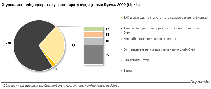 Жеке блок ретінде Қазақстандағы сөз бостандығын бұзудың жеңілірек санаты — ақпаратты алу және тарату құқықтарын бұзуды айтуға болады. Бұл бөлімде былтырғы статистика да айтарлықтай өсті: 2021 жылмен салыстырғанда 53,8% көбейген. Мұндай істер енді ондап емес, жүздеп саналады. Былтыр «Әділ сөз» қоры осындай 326 арыз-шағымды тіркесе, бір жыл бұрын 212 шағым түскен.