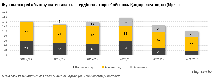Жалпы былтыр журналистерге қатысты 101 іс қаралған. Бұл соңғы жылдардағы ең төменгі көрсеткіш екені қуантады. 2017 жылдан бері мұндай істердің саны 120–150 аралығында.
