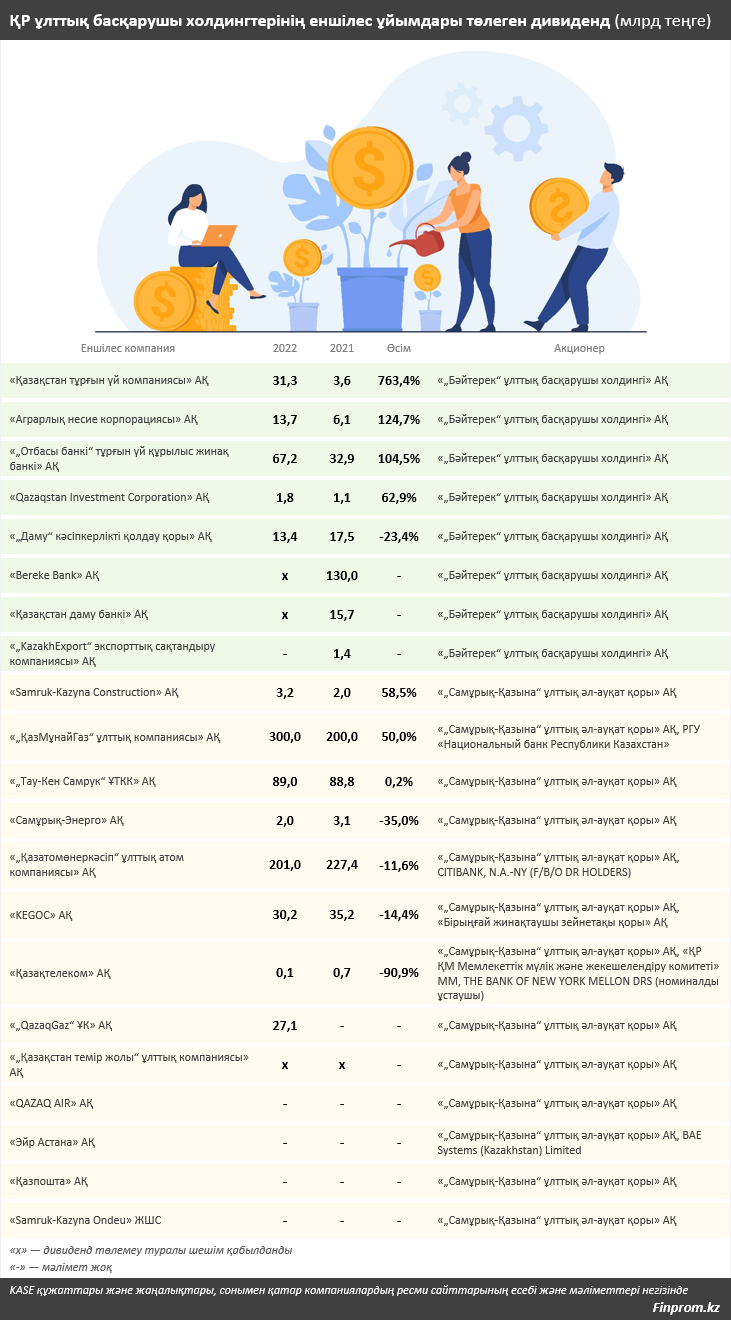 екі ұлттық басқарушы холдинг жұмыс істейді — «„Бәйтерек“ ұлттық басқарушы холдингі» АҚ және «„Самұрық-Қазына“ ұлттық әл-ауқат қоры» АҚ. Finprom.kz редакторлары осы холдингтердің еншілес компаниялары өз акционерлеріне қанша дивиденд төлегенін анықтап көрді, деп хабарлайды