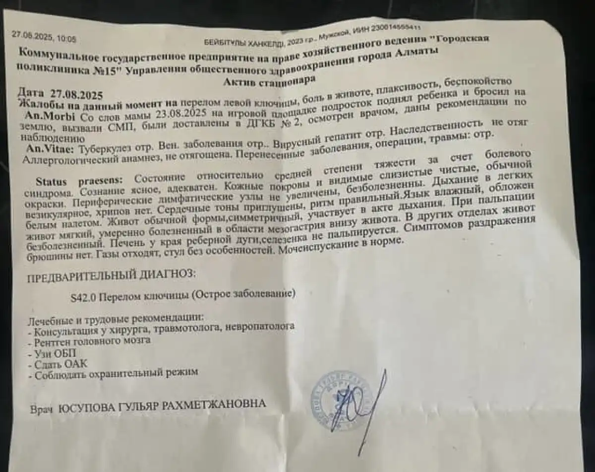Бүлдіршін дереу жедел жәрдеммен №2 қалалық балалар ауруханасына жеткізілген. Дәрігерлердің қорытындысына сәйкес, баланың сол жақ бұғанасы (ключица) сынған. Жағдайы – орташа ауырлықта. Жарақат алғаннан кейін рентген жасалып, қолы таңылып, үйіне жіберілген. Қосымша тексерулер — МРТ, УЗИ және қан талдауы — тек сүйегі біткеннен кейін ғана жасалатыны айтылған.