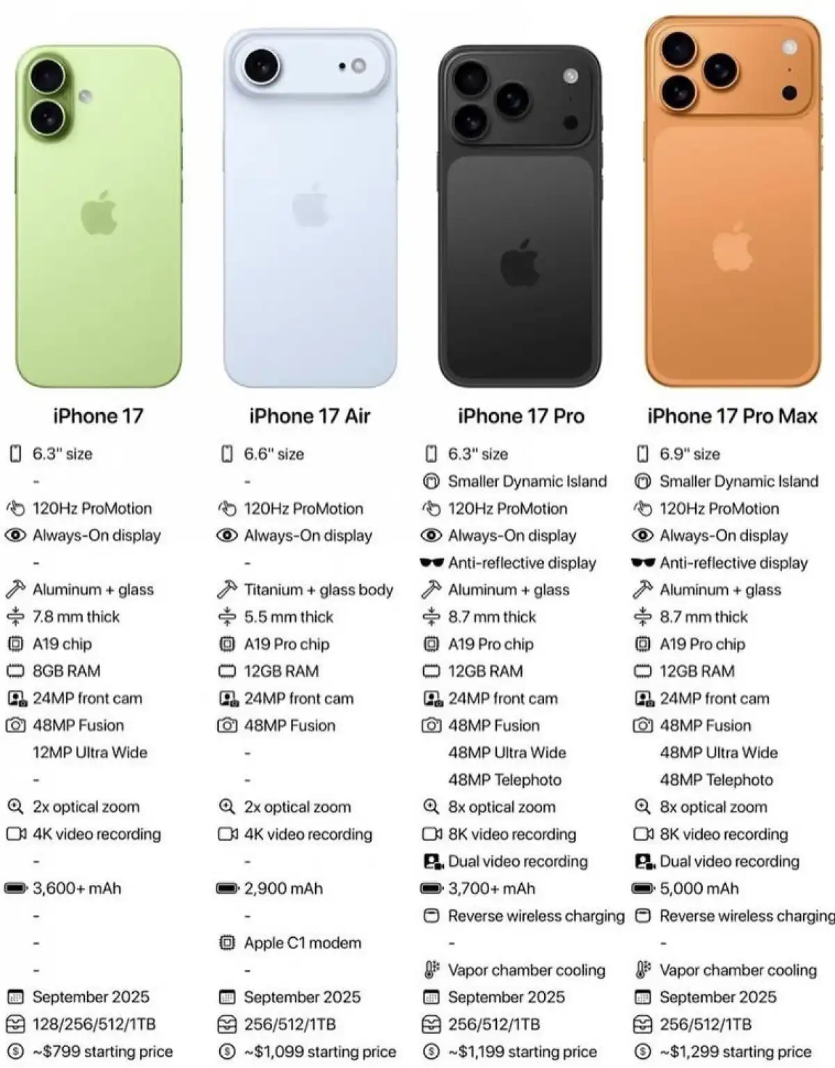 Apple тарихындағы ең жіңішке смартфон – қалыңдығы небәрі 5,6 мм. Титаннан жасалған, Super Retina XDR дисплеймен, Ceramic Shield 2 қорғанысымен шықты. A19 Pro процессорымен жабдықталған. Тек eSIM қолдайды, физикалық SIM-карта салуға болмайды.
