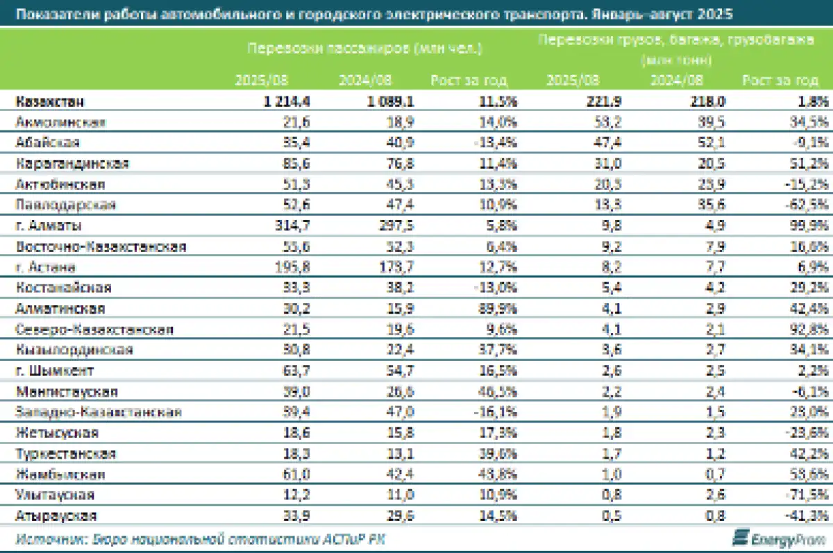 Energyprom.kz дерегінше, өңірлер арасында көшті Алматы бастады – мұнда 314,7 млн жолаушы тасымалданып, республикадағы жалпы көлемнің 25,9%-ын құрады. Жылдық өсім – 5,8%. Одан кейінгі орындарда Астана (195,8 млн жолаушы, +12,7%) және Қарағанды облысы (85,6 млн жолаушы, +11,4%). Ең төмен көрсеткіштер Ұлытау (12,2 млн), Түркістан (18,3 млн) және Жетісу (18,6 млн) облыстарында тіркелді.