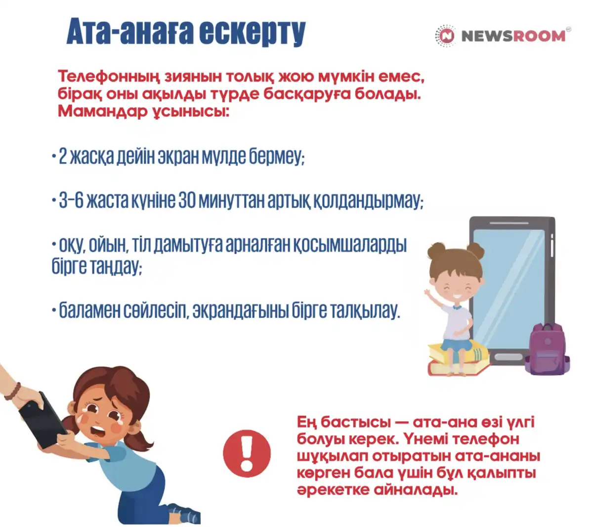 Ең бастысы — ата-ана өзі үлгі болуы керек. Үнемі телефон шұқылап отыратын ата-ананы көрген бала үшін бұл қалыпты әрекетке айналады.