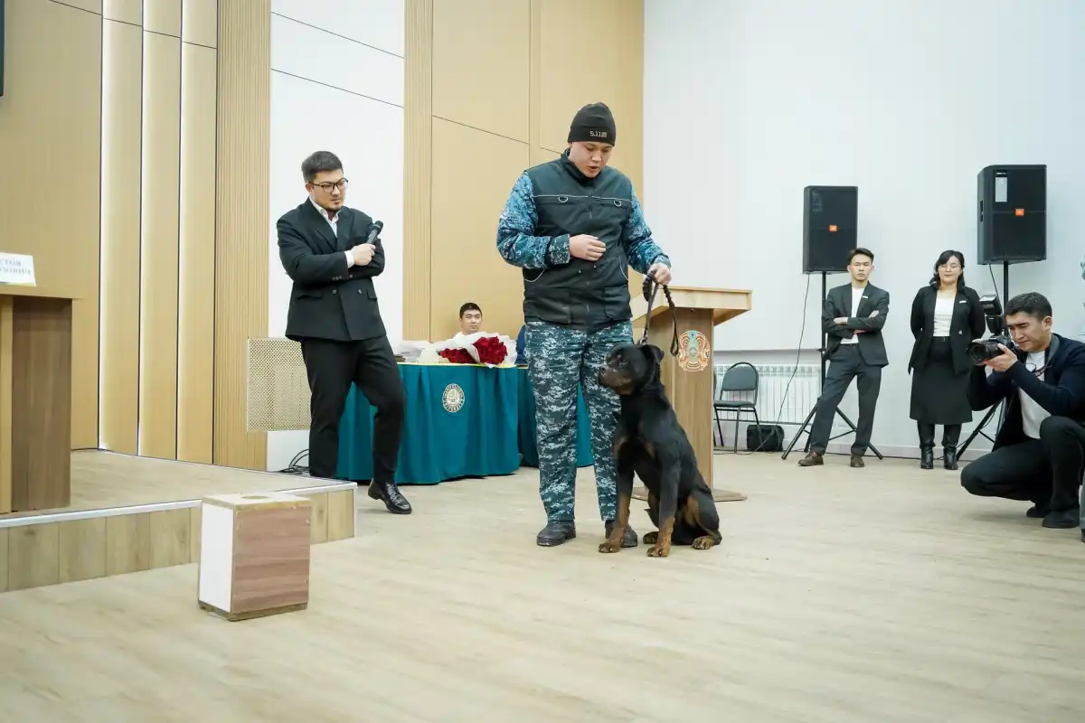 Сонымен бірге, студенттер алдында арнайы жедел әрекет ету жасағы – СОБР қызметкерлері кәсіби дайындық элементтерін көрсетіп, өз жұмысының ерекшеліктерімен бөлісті. Кинологиялық орталықтың мамандары қызметтік-іздестіру иттерінің мүмкіндіктерін таныстырып, олардың есірткі заттарын анықтаудағы рөлін көрсетті.