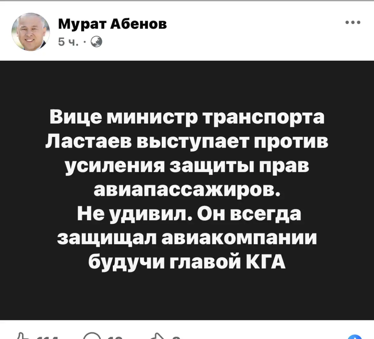 «Вице-министр Ластаев әуе жолаушыларының құқығын қорғауды күшейтуге қарсы шығып отыр. Таңғалмаймын. Азаматтық авиация комитетін басқарған кезде де ол үнемі әуе тасымалдаушыларын жақтап келген», – деді депутат.