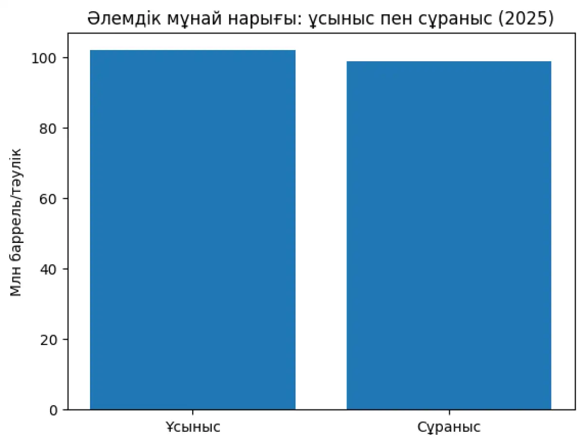 Халықаралық сарапшылардың бағалауынша, алдағы жылы да әлемдік мұнай нарығында артық ұсыныс сақталуы мүмкін. Өндіріс өсіп жатқанымен, сұраныс тарихи тұрғыдан баяу қарқынмен артып отыр. Бұл бағаның жоғары деңгейге тез оралуына кедергі келтіруі ықтимал.