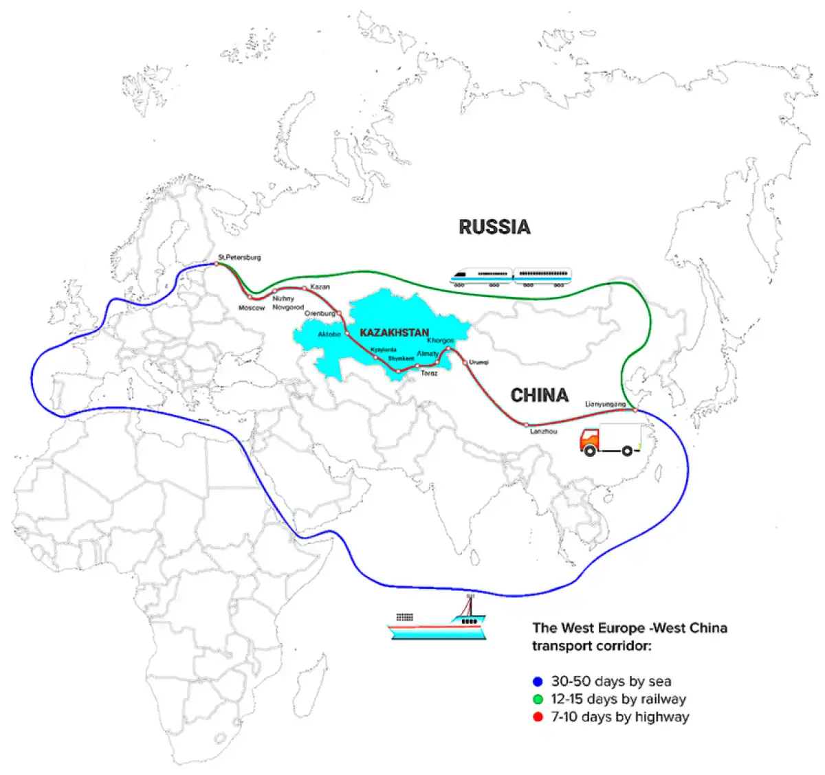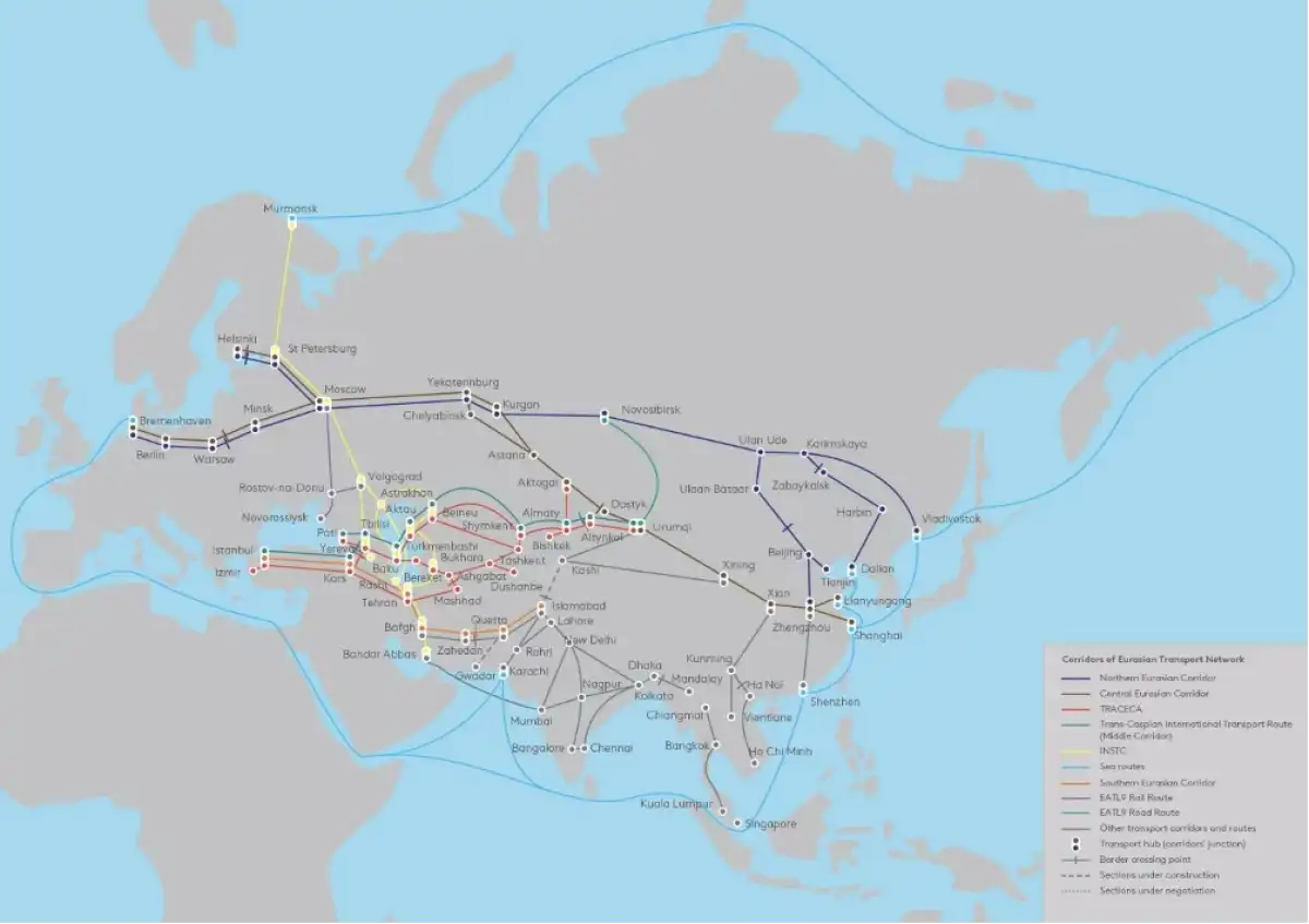Қазақстан Президенті Жоғары Еуразиялық экономикалық кеңес отырысында сөйлеген сөзінде ЕАЭО құрамына кіретін елдердің аумағы арқылы маңызды халықаралық көлік дәліздері өтетінін атап өтті. Атап айтқанда, Батыс Еуропа – Батыс Қытай, Солтүстік – Оңтүстік және Транскаспий халықаралық көлік бағыты.