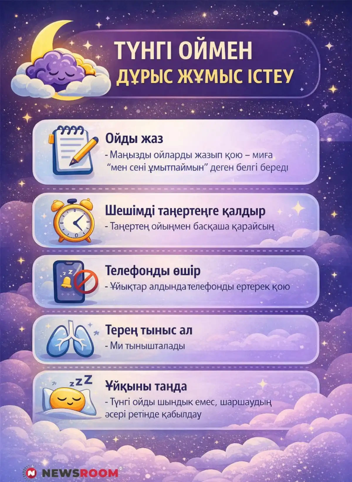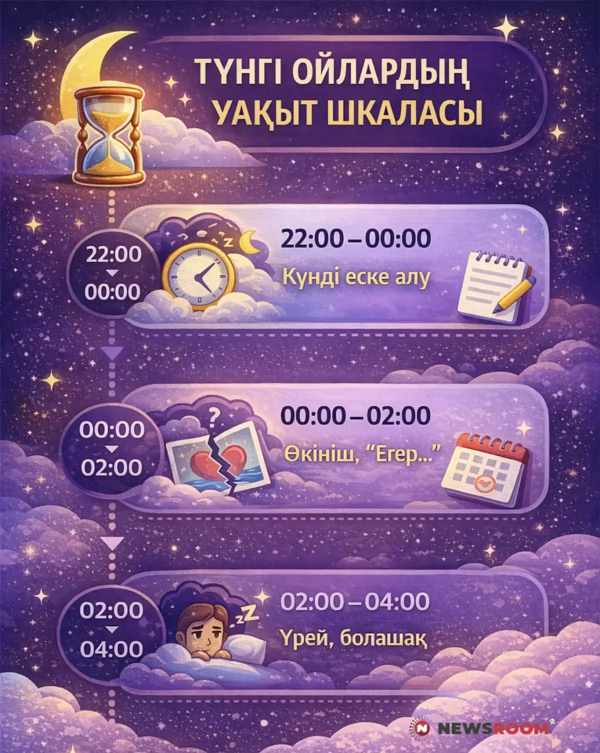 Түнде ойға бату – әлсіздік емес. Бұл адамның ойлай алатын, сезе алатын тірі жан екенінің белгісі. Бірақ түн – мәселе шешетін емес, оны байқап, түсінетін уақыт. Ал шешімді таңертең қабылдаған дұрыс.
