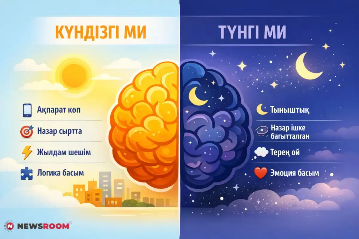 Күндіз ми үнемі сыртқы ақпаратты өңдеумен әлек: әңгіме, хабарлама, жұмыс, әлеуметтік желі, міндеттер. Бұл кезде мидың «жылдам режимі» іске қосылады. Ал түнде сыртқы тітіркендіргіштер азайғанда, ми терең ойға жауапты бөлімдерді белсендіріп, өзіндік талдауға көшеді.