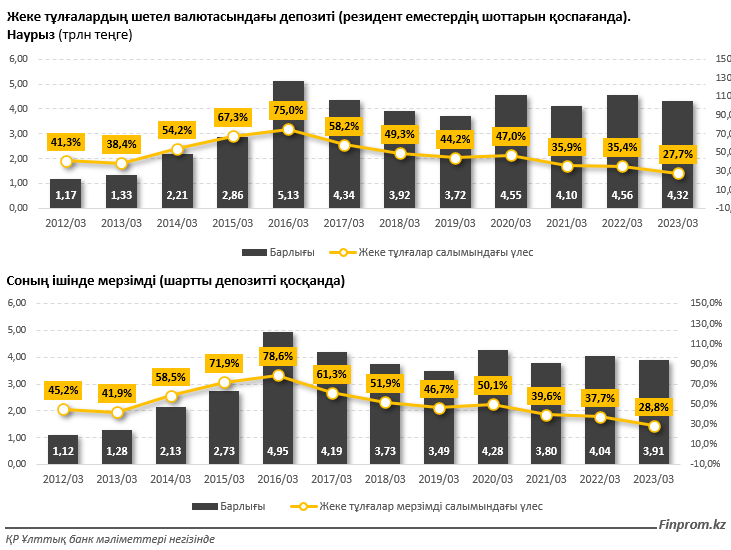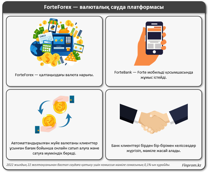 Қазақстандықтардың ҚР банктерінде 4,3 трлн теңге шетел валютасындағы депозиті бар, оның 3,9 трлн теңгесі мерзімді депозит (яғни, қаражатты сақтауға және жинақтауға арналған депозит). ҚР азаматтарының депозиттеріндегі шетел валютасының үлесі әлі де көп: биыл наурыз айында ол 27,7% болды. Мерзімді депозиттер бойынша шетел валютасының үлесі 29%-ға жуықтады. Анықтама үшін: жалпы, резидент еместерді қоса алғанда, барлық жеке тұлғалардың қазақстандық банктерде 5,6 трлн теңгенің шетел валютасындағы депозиті бар (биылғы 1 сәуірдегі дерек). Бұл еліміздегі жеке тұлғалардың жалпы депозитінің 32,7%-ы. Оның ішінде шетел валютасындағы мерзімді депозит 4,6 трлн теңгені немесе шетелдіктердің шоттарын қоса алғанда жеке тұлғалардың барлық мерзімді депозиттерінің 31,7%-на тең. Бір жағынан, ҚР-да долларсыздандыру жүріп жатқанымен, қазақстандықтардың жинақ ақшасындағы шетел валютасының үлесі кестелерден көрініп тұрғандай, жылдан жылға біртіндеп азайып келеді. Екінші жағынан, ҚР резиденттерінің шетел валютасынан бас тарта қоятыны байқалмайды. Мемлекет пен халық арасындағы осындай мүдделер тепе-теңдігін ескере отырып, ҚР ЕДБ көпшілігі өз банктік қызметі арқылы клиенттерге ыңғайлы онлайн конверсияны ұсынады. Нарықта мүмкіндіктері кеңірек бірегей өнім бар: ForteForex валюталық сауда платформасы. ForteForex ForteBank клиенттеріне валюталарды өз бағамы бойынша сатып алуға және сатуға мүмкіндік береді. Банк клиенттері делдалсыз, спрэдсіз және кез келген басқа да шығынсыз өзара валюта саудалай алады. Платформадағы барлық транзакциялар қатаң құпия. Бұл сектордағы онлайн қызметтер ҚР-дағы интернеттендіру мен цифрландырудың жалпы дамуына орай өзекті. Мысалы, Қазақстан ЕАЭО және Орталық Азия елдері арасында интернет жылдамдығы бойынша бірінші орында. Сонымен қатар, Қазақстандағы қала тұрғындарының интернетпен қамтылуы 95%, ауылдықтарда бұл көрсеткіш — 94%, бұл ретте әлемдік орташа көрсеткіш қалада 82%, ауылда — 46% ғана. Яғни, қаражатты шетел валютасына айырбастау банк бөлімшесінің жақындығына қарамастан ҚР-ның барлық өңірлерінің барлық тұрғындарына дерлік онлайн режимінде қолжетімді. Қазақстандықтардың шетел валютасына деген сұранысы елдегі айырбастау пункттеріндегі сауда-саттықтан байқалады. Биыл бірінші тоқсанда ҚР айырбастау пункттерінің АҚШ долларын таза сатуы 385,5 млрд теңге болды, былтыр сәйкес кезеңде көрсеткіш 441,5 млрд теңге болған. Еуроның таза сатылымы бір жыл бұрын 57,9 млрд теңге болса, биыл 74,6 млрд теңгеге жетті. Жалпы, 2022 жылдың 12 айында АҚШ долларының таза сатылымы 1,8 трлн теңге, еуро — 301,9 млрд теңге болды.