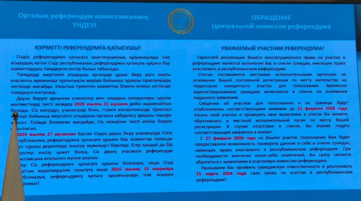 Орталық сайлау комиссиясы жаңа Конституция жобасы бойынша өтетін республикалық референдумға дайындық және өткізу кестесін жариялады. Маңызды саяси науқан 2026 жылғы 15 наурызға белгіленген.
