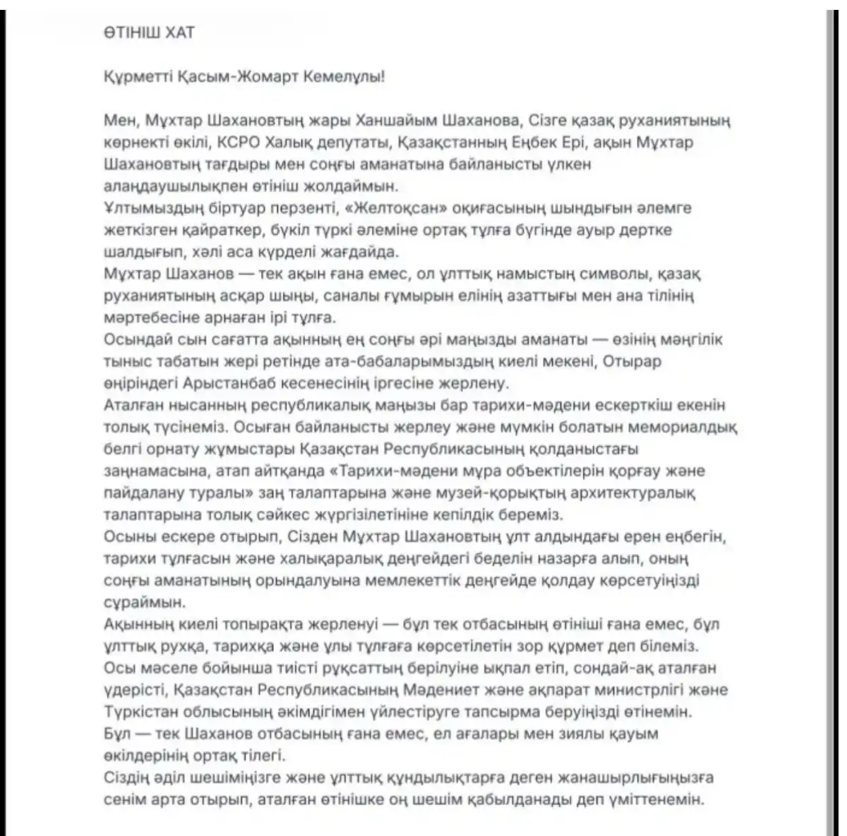 Айта кетейік, Ханшайым Шаханова бұл өтінішті ақын ауыр хәлде жатқан сәттен бастап жазған. Хатта Мұхтар Шахановтың соңғы аманаты нақты көрсетілген.